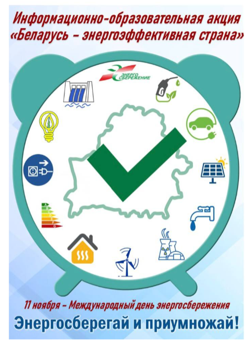 С 10 по 20 ноября 2025 года Департамент по энергоэффективности проводит республиканскую информационно-образовательную акцию «Беларусь – энергоэффективная страна». Она приурочена к Международному дню энергосбережения (11 ноября). Акция проводится в целях реализации положений Директивы Президента Республики Беларусь от 14.06.2007 № 3 «О приоритетных направлениях укрепления экономической безопасности государства», Закона Республики Беларусь от 08.01.2015 № 239-З «Об энергосбережении».