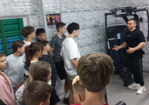 Артём дал возможность заглянуть в мир силы и эстетики тела, поделился тонкостями своего тренировочного процесса, рассказал о важности восстановления, нюансах питания и о своем первом опыте выхода на сцену. Закончили беседу планами на будущее и спустились в тренажерный зал, где Артём познакомил ребят с новыми тренажерами, рассказал какие группы мышц можно проработать с их помощью и показал технику выполнения упражнений.